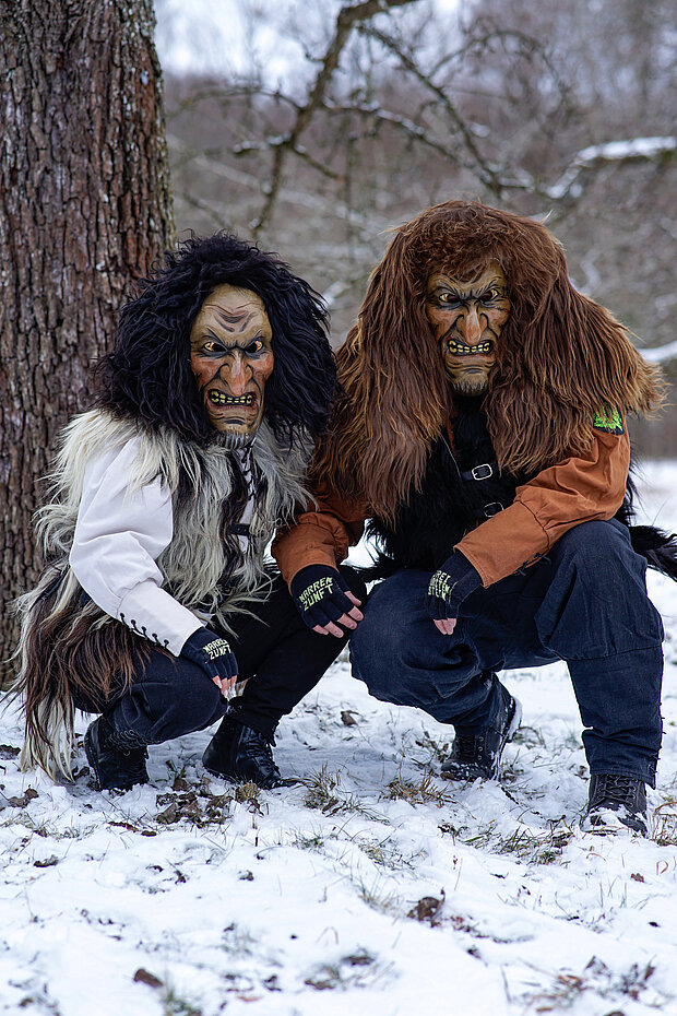 Die Bauern treten als rau wirkende Gestalten auf, tief verwurzelt in alten Sagen und bäuerlichen Traditionen. Mit ihren markanten, grob geschnitzten Masken, den wulstigen Augenbrauen und dem grimmigen Blick verkörpern sie die Härte und Entschlossenheit früherer Landbewohner. Die zotteligen Fellgewänder und rustikalen Stoffjacken verleihen ihnen ein urtümliches, fast schon tierisches Erscheinungsbild – als wären sie direkt aus vergangenen Zeiten entsprungen.